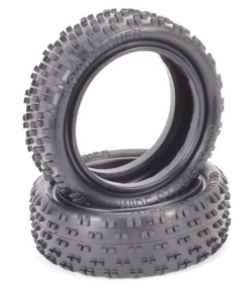 🛞 The Schumacher Stagger Rib Front 4WD Yellow tires are designed to provide maximum grip on high-traction surfaces such as astro turf and carpet. Their enlarged staggered rib profile improves front-end grip while maintaining high stability and precise steering. The yellow compound is ideal for dry conditions and 1/10 competition.