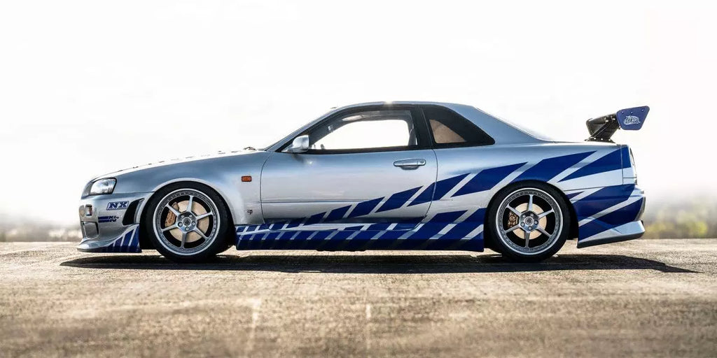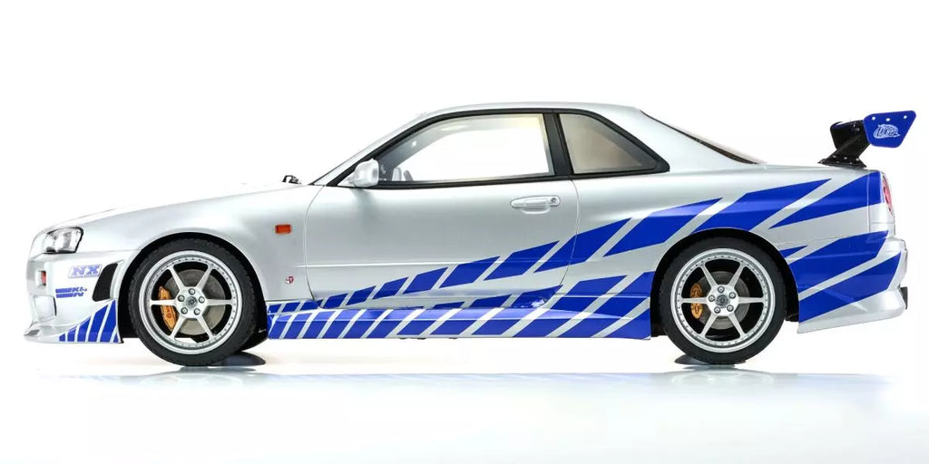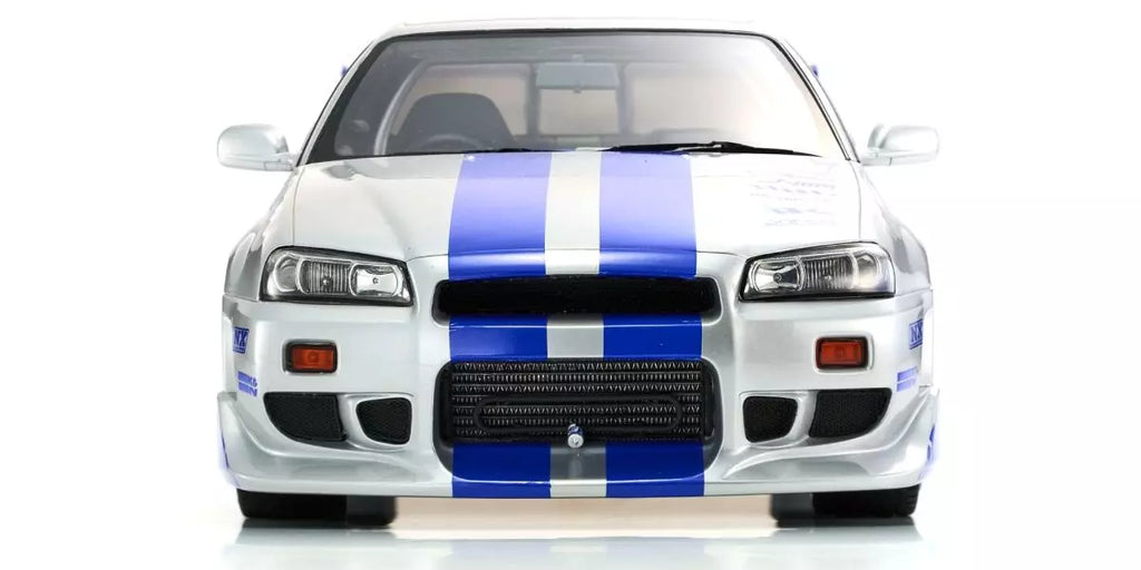 🚗 El Nissan Skyline R34 GT-R 2001 «Fast & Furious» Kyosho Original 1/12 es un coche en miniatura de colección de alta gama inspirado en el mítico GT-R conducido por Brian O'Conner en 2 Fast 2 Furious. Verdadero icono del cine automovilístico y de la cultura JDM, este R34 con carrocería plateada adornada con rayas azules estroboscópicas está reproducido con gran fidelidad. Producido por Kyosho Original, referencia mundial en miniaturas desde 1991, ofrece un rendimiento visual excepcional a escala 1/12.